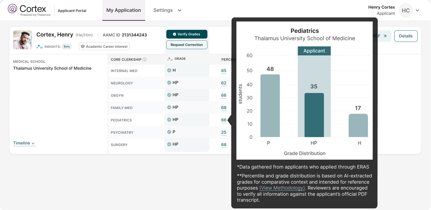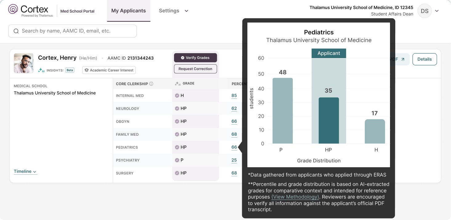 For example, the number of students receiving a grade of “honors” in a core clerkship across medical schools ranges between 0% for Pass/Fail, to 5% at the low end and 99.9% at the high end, with 30-40% for the average institution. Cortex provides percentiles so that program directors can identify these patterns in a more streamlined way to mitigate perceived grade inflation and provide a comparative context to evaluate applicants. The tool also identifies items from applicant source documentation (MSPEs, transcripts, etc.) that previously may have gone unnoticed.