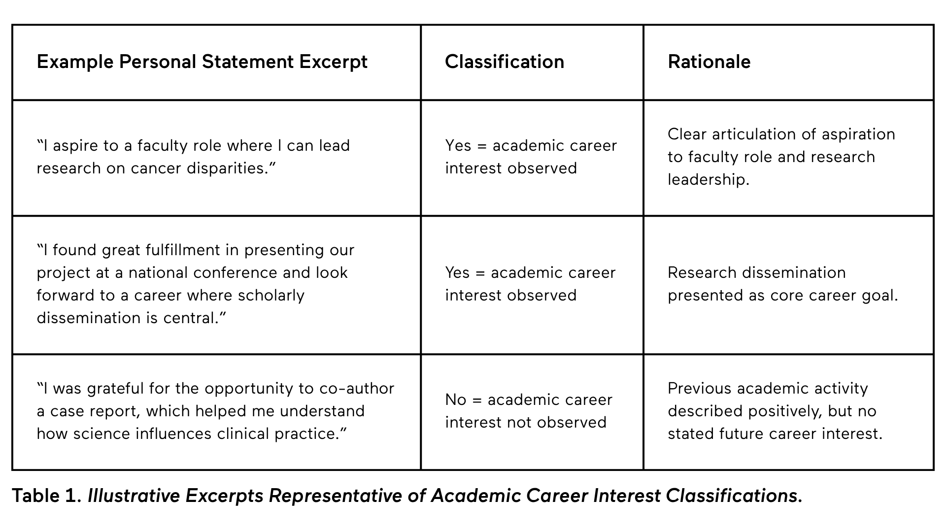 However, interpretations of these narratives may vary widely. Some applicants state their aspirations explicitly (e.g. “I have a career interest in becoming an academic anesthesiologist.”), while others embed them indirectly within experiences or values. This variability can complicate effort to identify academic career interest reliably, particularly when faculty must review large volumes of applications under time constraints.